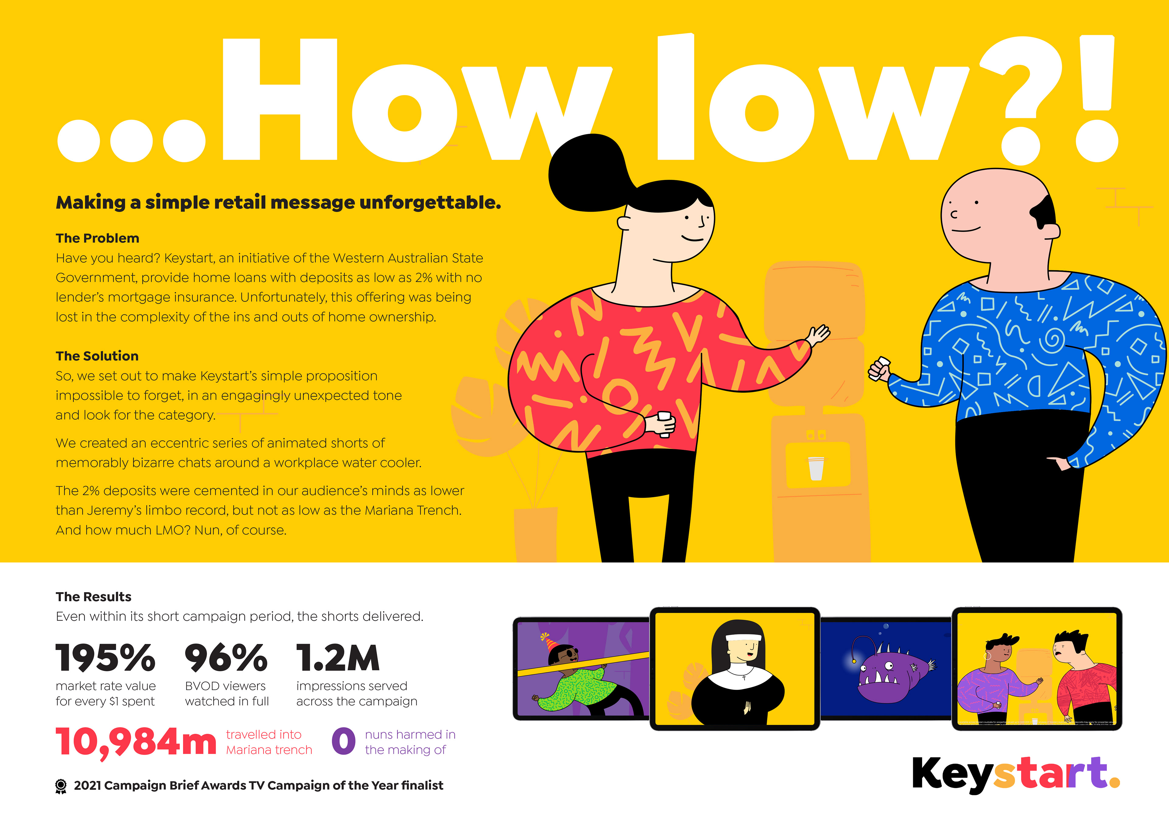 Providing home loans with deposits as low as 2% without lender’s mortgage insurance, Keystart’s offering was being lost in the complexity of the journey to home ownership, often being confused with everyone from builders to brokers or banks. To address this, The Brand Agency worked closely with Keystart to produce a series of humorous and distinctive radio spots and animated online videos to run across broadcast video on demand and social media.